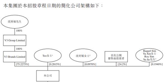截至招股说明书签署日,沈财福透过V3 Brands Limited(一家由V3 Group Limited全资拥有的投资控股公司)及V3 Group Limited(一家由沈财福全资拥有的投资控股公司)拥有V3的股份权益约为75.23%,沈财福的配偶(TEO Sway Heong)拥有V3的股份权益约为0.28%。Teo作为沈财福的配偶被视为沈财福的紧密联系人。因此,根据上市规则,沉财福、V3 Group Limited、V3 Brands Limited及Teo被视为公司的控股股东。