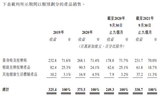 该公司超过70%的收入来自于养身椅及按摩椅。招股书显示,2019年、2020年、2021年1-9月,养身椅及按摩椅的收益分别为2.33亿新加坡元、2.68亿新加坡元、2.32亿新加坡元,占比分别为71.6%、71.4%、70.0%。