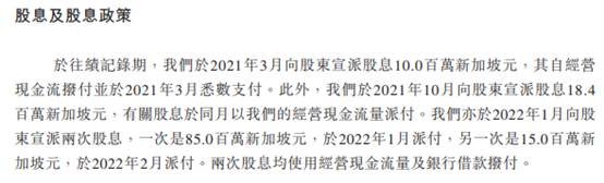 有必要注意一下的是,上市前,V3一年内累计派息4次,共派息1.28亿新加坡元。其中,V3于2021年3月向股东宣派股息1000万新加坡元,其自经营现金流拨付并于2021年3月悉数支付;于2021年10月向股东宣派股息1840万新加坡元,有关股息于同月以经营现金流量派付。