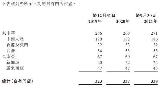 V3在招股书中称,于2021年9月30日,公司在全球22个市场逾90个城市设有自有门店及特许经营店。公司于核心市场销售产品,包括大中华市场(包括在中国大陆、香港、澳门及台湾的运营)及东南亚市场(包括在新加坡及马来西亚的运营),并于16个市场透过特许经营店销售产品。于2021年9月30日,公司有338家自有门店及115家特许经营店。