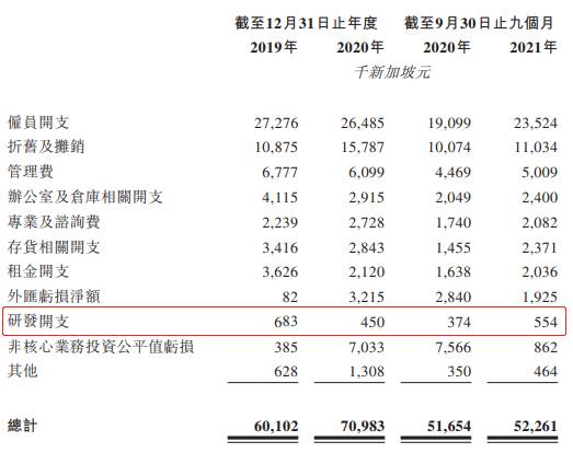 V3表示,我们的业务大幅受惠于我们在研发方面的强大往绩记录。然而,据其招股书披露,于2019年、2020年以及2021年的前三季度,V3产生的研发开支分别为68.3万新加坡元、45.0万新加坡元及55.4万新加坡元。